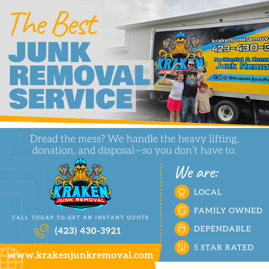 Kraken Junk Removal proudly serves the entire Tri-Cities, TN region, providing fast, reliable, and affordable junk removal to both residential and commercial customers. Our service area includes: Bloomingdale, Blountville, Bluff City, Bristol, Chuckey, Church Hill, Colonial Heights, Elizabethton, Erwin, Fall Branch, Gray, Greeneville, Johnson City, Jonesborough, Kingsport, Mount Carmel, Oak Grove, Piney Flats, Spurgeon, Surgoinsville, Telford, Unicoi, and Watauga.